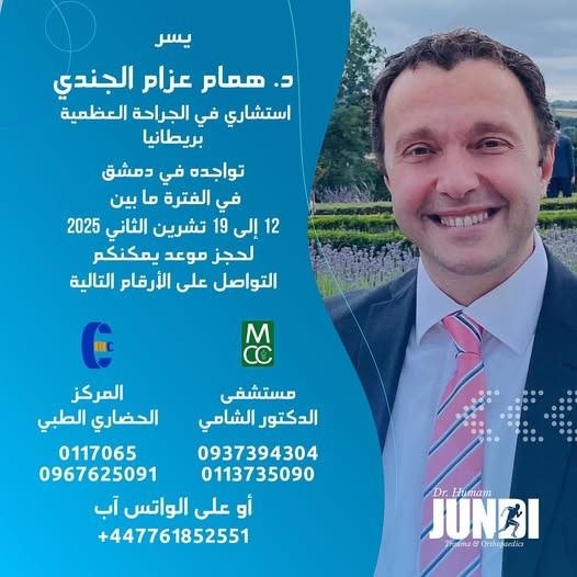 سيتواجد الدكتور همام عزام الجندي الاستشاري في الجراحة العظمية في مشفى Stepping Hill Hospital في مدينة مانشستر – بريطانيا، والأخصائي في جراحة تنظير مفصل الكتف في دمشق في الفترة بين 11 ولغاية 19 تشرين الثاني، وستكون فرصة هامة للرياضيين والمرضى الذين يعانون من آلام الكتف لمناقشة الدكتور همام في أحدث الاتجاهات العلمية العالمية لإنهاء معاناتهم.